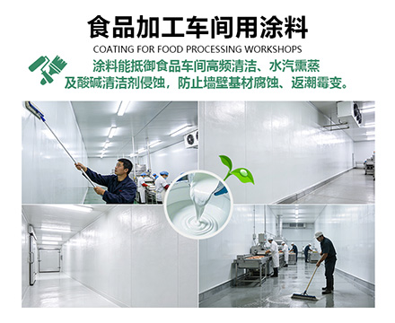 施工方便,可直接涂刷于混凝土、水泥砂浆、瓷砖等常见车间墙壁基材;视觉适配,提供食品车间常用浅色涂层,颜色均匀无色差;长效耐受,在正常使用和维护下,涂层寿命可达8—10年;易清洁耐擦洗,食品残渣可通过清水或常规清洁剂快速冲洗去除。